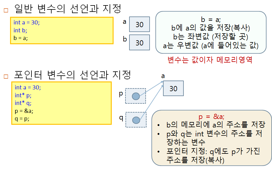 포인터의 지정은 일반 변수와 어떻게 다를까요? 다음 그림에서 두 가지를 비교하고 있습니다.