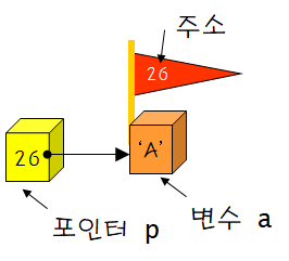 변수 a는 어딘가 메모리에 할당될 것이고 그 주소는 그림에서는 26입니다. 그러면 포인터 p의 메모리에는 26이라는 값이 저장됩니다. 그리고 p는 변수 a를 가리키는 포인터입니다. 우리는 “p에 a의 주소를 저장했다. 또는 p가 a를 가리킨다"라고 읽습니다.