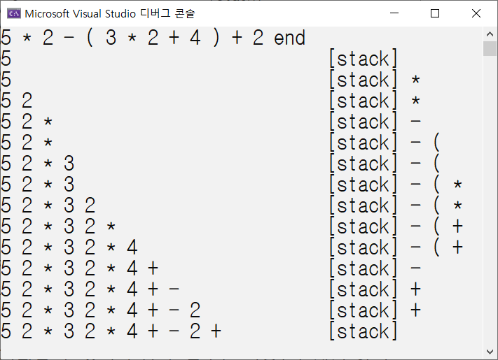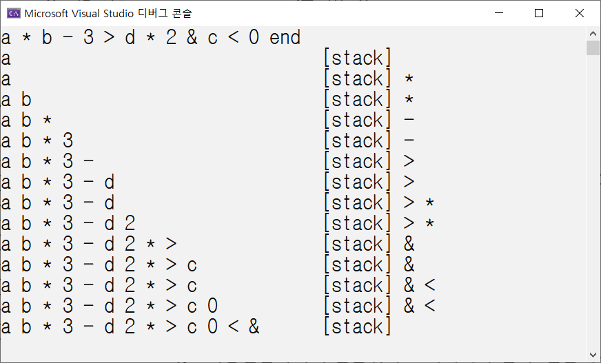이번에는 스택을 이용하여 중위표기식을 후위표기식으로 바꾸는 것을 해보자. 실행결과는 다음과 같이 보여주고 싶다.