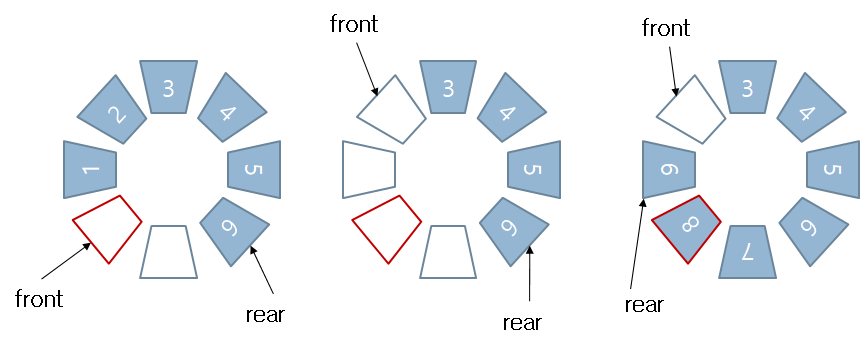 위의 문제를 해결하기 위해서 rear가 증가하다가 큐의 마지막까지 가면 다시 앞에서부터 빈 자리에 채워넣을 수 있게 하는 것이 원형 큐(circular queue)다. 원형큐라면 enqueue와 dequeue에서 끝에 도달한 경우 다시 앞에서부터 시작하게 해주어야 한다.