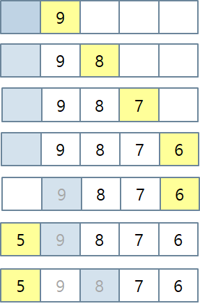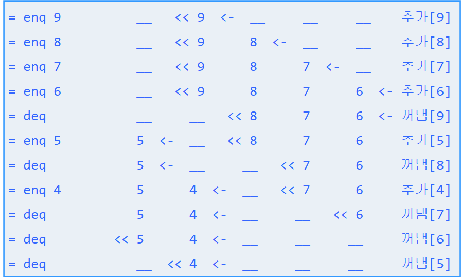 위 그림은 배열 기반의 원형큐의 동작을 보여준다. rear가 마지막 칸을 지나서 첫번째 칸으로 이동하는 것을 볼 수 있다. 또한 여기서 한가지 언급할 것은 front에서 나간 값은 지워지지 않고 그대로 있다는 점이다. 단지 front가 증가하므로써 그 값은 쓰레기가 된다. (그림에서 회색 글자로 표시된 데이터 부분) 프로그램에서는 많은 경우 사용한 메모리의 값을 청소하지 않고 그냥 둔다. 그러므로 사용하는 사람이 뭔가 값을 기록하면서 그 값은 의미있는 데이터가 되고 그 전에는 쓰레기 값이 들어있음을 항상 유념해야 한다.