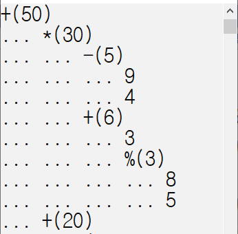 이 수식에 대한 이진트리는 다음과 같은 형태로 나타낼 수 있다. 이것은 트리의 출력기능을 통해 출력한 결과다.