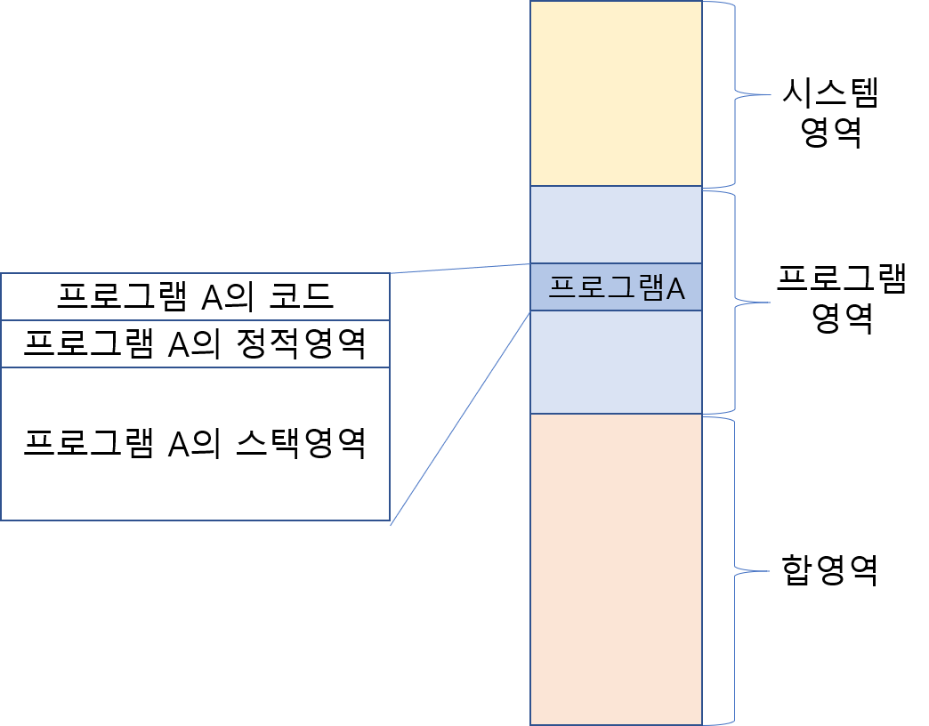 그런데 컴퓨터에서 수행중인 프로그램은 아주 많으므로 컴퓨터(OS) 관점에서 볼 때 여러 개 프로그램이 필요한 만큼 메모리를 넉넉하게 줄 수는 없습니다. 그래서 컴퓨터는 각 프로그램이 사용하는 메모리를 제한하고 종류를 나누어 규칙에 따라 사용하도록 하고 있습니다. 그래서 메모리는 정적, 스택, 힙 세 종류로 나누어 집니다.