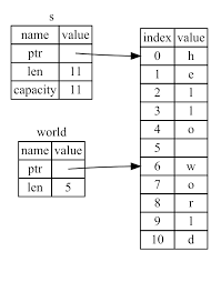 이 그림은 문자열에 대한 슬라이스를 보여주지만 개념은 같습니다. 배열 s에 대해 중간부터 길이 5의 슬라이스를 나타내는 world라는 변수가 생긴 것이지요. 이 때 world는 참조를 대여한 것이라고 볼 수 있습니다.