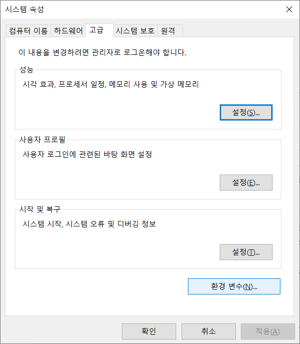 4. 다음과 같은 창이 보이면 "환경변수..." 버튼을 선택한다.