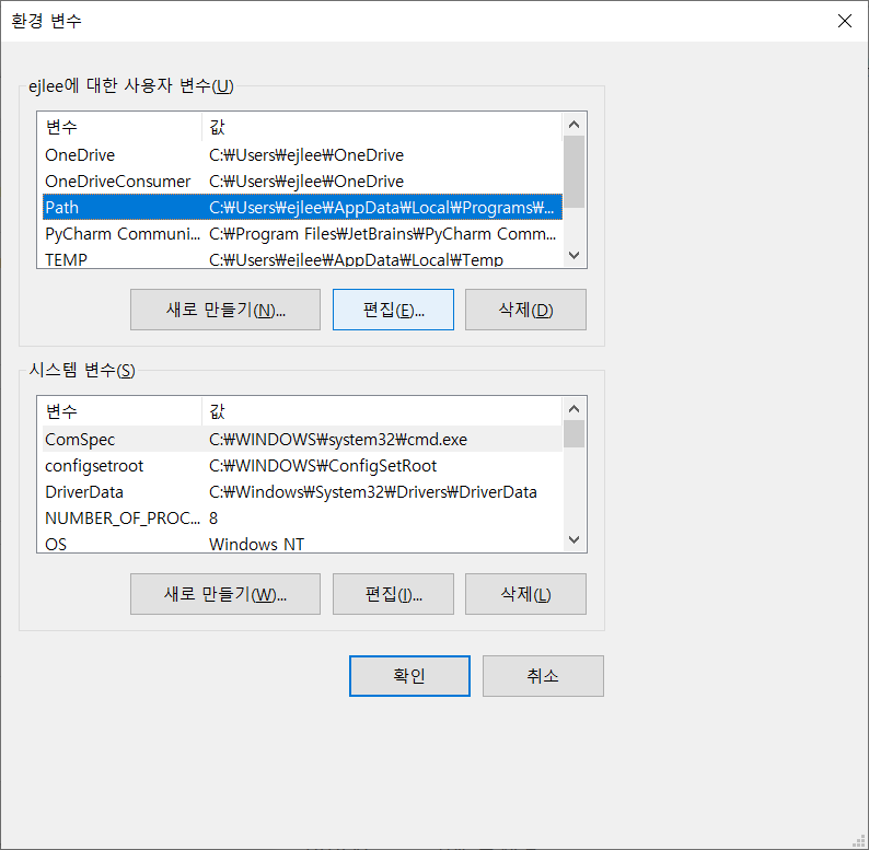 5. 사용자 변수에서 "Path"를 선택하고 편집 버튼을 누른다.