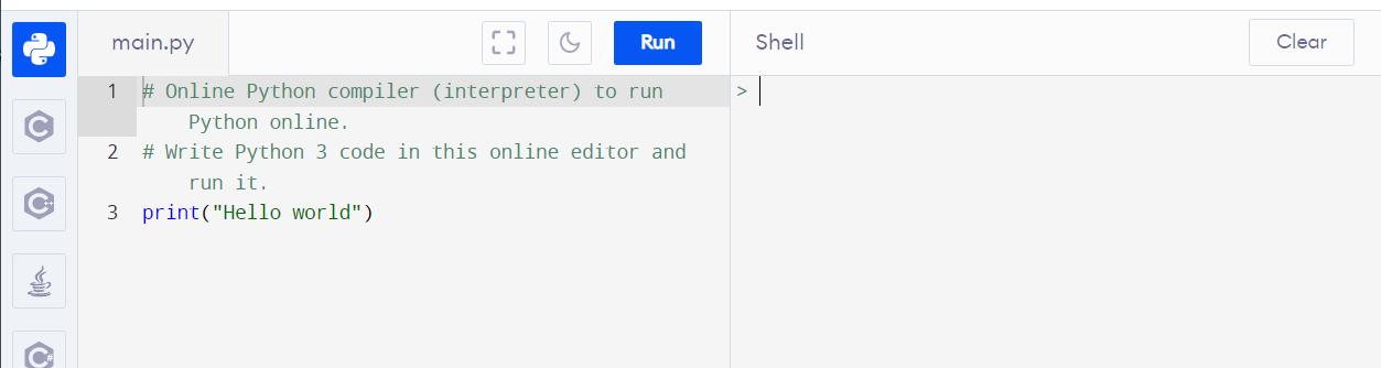 그럼 playground 사이트의 왼쪽 창은 뭘까요? 이곳은 편집창입니다. 오른쪽 쉘 창은 명령 한줄 쓰고 엔터 치면 바로 실행하는데, 우리가 프로그램이라고 하면 연속된 여러 가지 명령을 수행해서 그 결과를 보고 싶은 경우가 많습니다. 뭐라도 좀 그럴듯한 일을 하려면 여러 줄의 명령을 한꺼번에 수행해야 되기 때문이죠. 그래서 그런 여러 줄의 명령을 한꺼번에 작성한 것이 프로그램(작업지시서)인데 그것을 편집할 수 있는 편집창입니다. 편집이 끝나면 Run을 실행해서 실행 결과를 볼 수 있습니다. 현재 창에서 Run 버튼을 누르면 기존에 작성되어 있는 프로그램 "Hello, World"를 출력하라는 프로그램을 실행하여 오른쪽 쉘창에 Hello World가 출력되는 것을 볼 수 있습니다.
