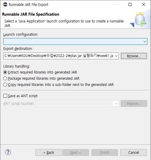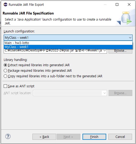 위의 단계를 거쳐 내보낼 프로젝트와 디렉토리를 선택하면 해당 파일이 export 된다. 지정한 디렉토리에 가보면 프로젝트 이름.jar 파일이 생성되어 있다.