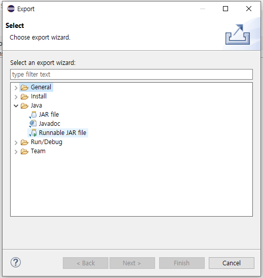 내가 만든 프로젝트를 jar 파일 형태로 다른 사람에게 제공하여 실행시켜 보게 하기 위해 Runnable JAR 파일을 export할 수 있다. 이것은 다음과 같은 순서로 할 수 있다.