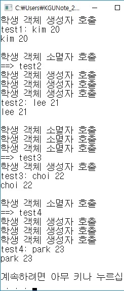 마지막으로 test4에서는 new student[3]에서 힙에 객체 세 개짜리 배열이 할당되는데, 이 때 생성자가 세번 호출되고 함수가 종료해도 소멸자가 불려지지 않는다. 힙 객체는 해지되지 않은 채 프로그램이 종료하면 힙 메모리는 모두 회수될 것이다.