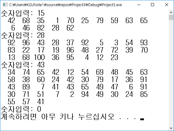 [문제 기초 2-5] 위 2-4 문제를 while 루프를 이용하여 사용자가 입력한 수가 0일 때까지 반복하도록 확장하시오. 이 때 배열은 100개 크기로 한번 선언한 것을 반복하여 이용한다.