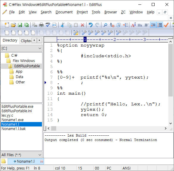 그럼 이제 렉스 실행할 준비를 마쳤으니 토큰을 정의한 렉스의 입력파일을 만들어보자. File 메뉴에서 New / Lex 를 선택한다. 그러면 렉스 입력을 위한 기본 파일이 Noname1.l 이라는 이름으로 열린다.