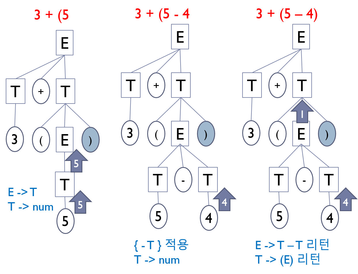 각 메소드는 자신의 생성규칙을 적용하여 트리를 만드는 일을 합니다. 그리고 더이상 생성규칙을 적용할 수 없으면 리턴합니다. (그 때까지의 결과값을 반환함)