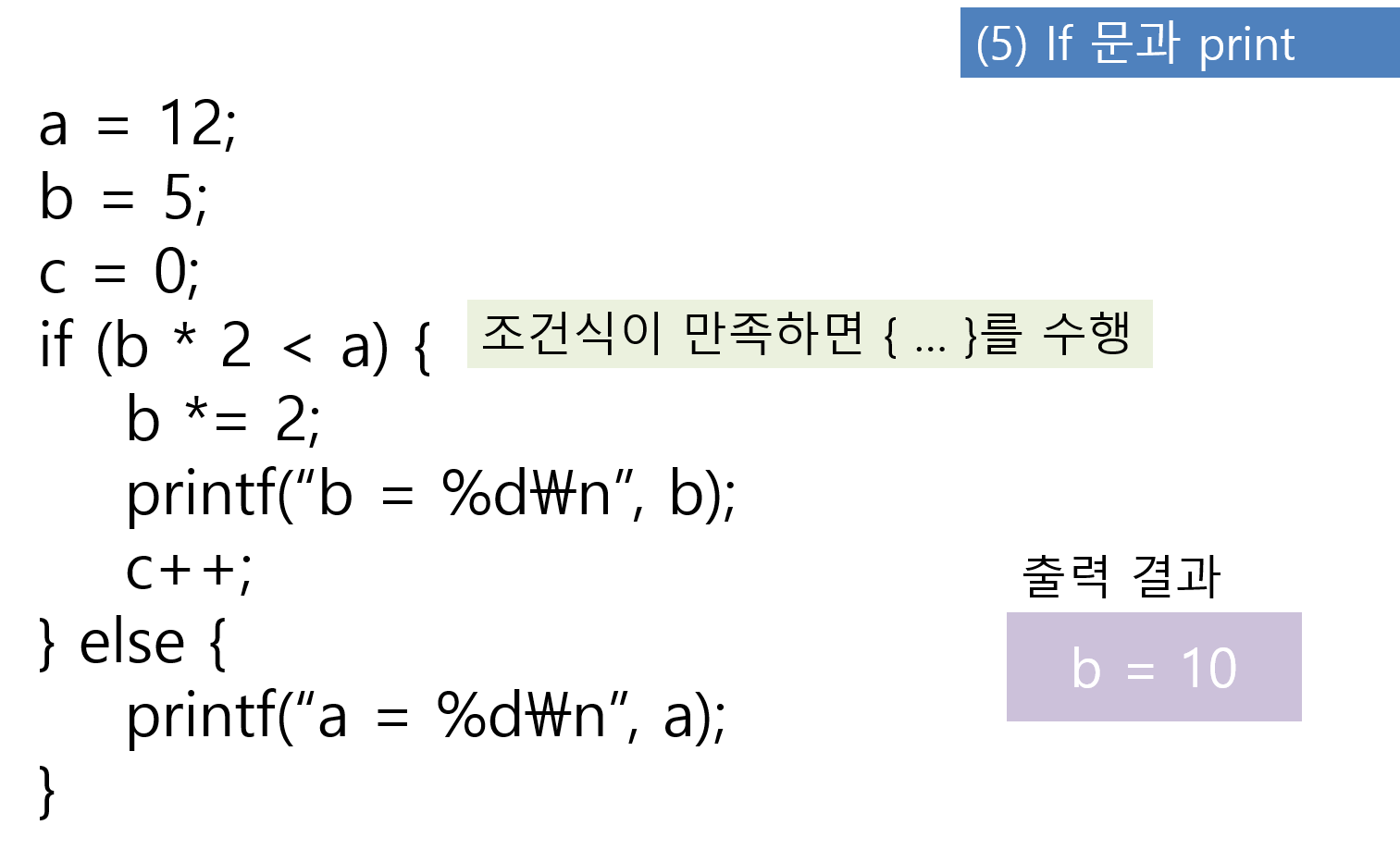 C 언어의 if 문은 if (조건식) { ... }와 같은 형태를 가집니다. 파이썬에서 :과 들여쓰기로 표시하던 부분을 여기서는 { ... }로 둘러싸서 나타내게 됩니다. C는 확실히 괄호를 자주 사용합니다.