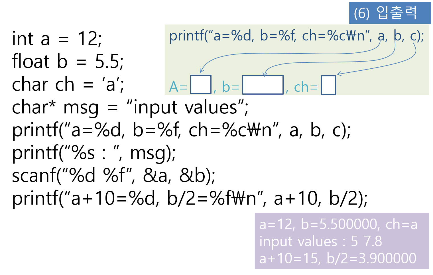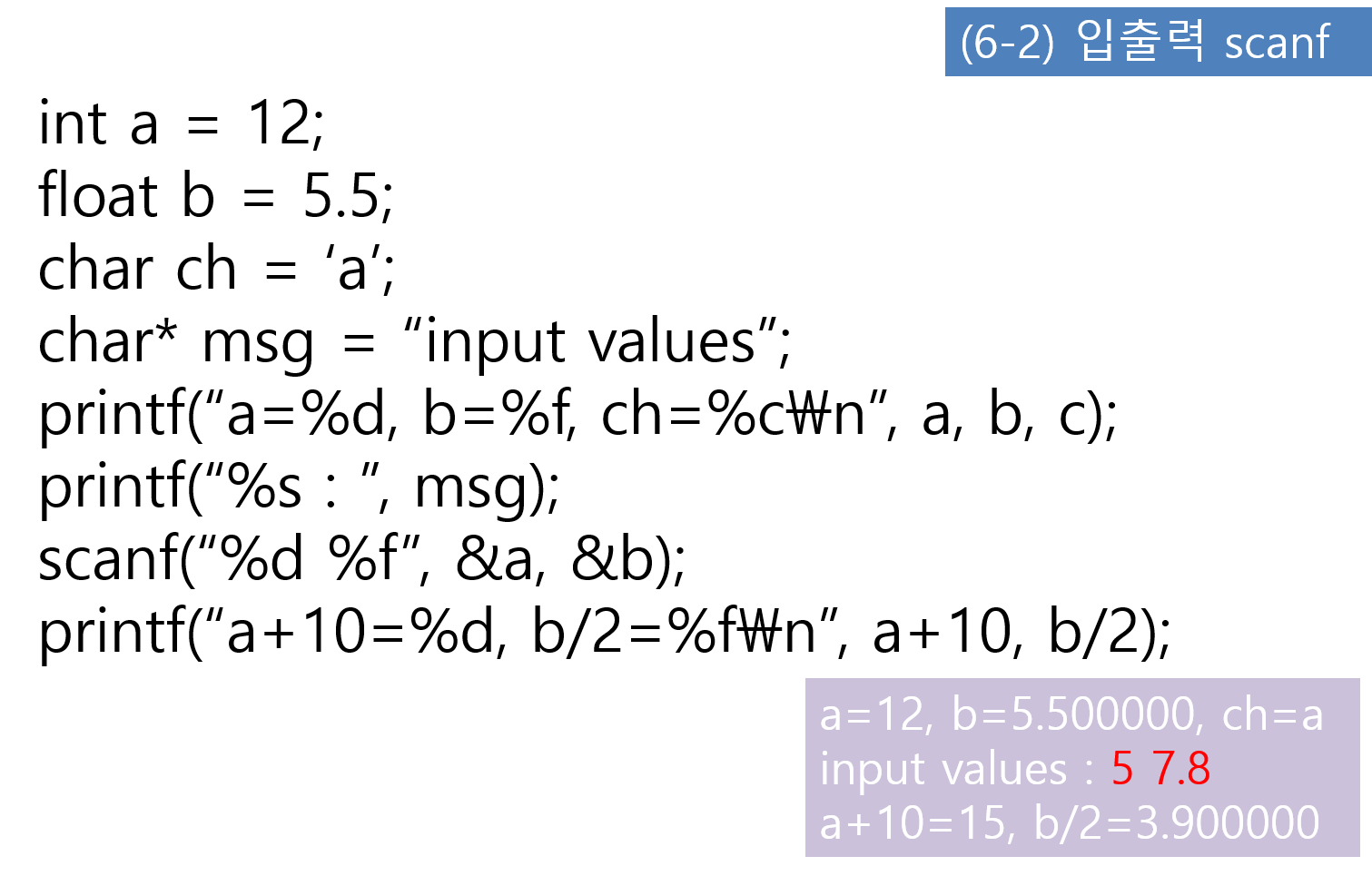 - scanf의 뒤에 이어지는 매개변수 : 뒤에 나오는 것은 변수만 가능합니다. 변수 앞에는 &를 붙여야 합니다. 이것은 값을 읽어 저장할 주소를 전달한다는 의미입니다. 나중에 포인터를 배우면 좀더 잘 이해하게 될 것입니다.