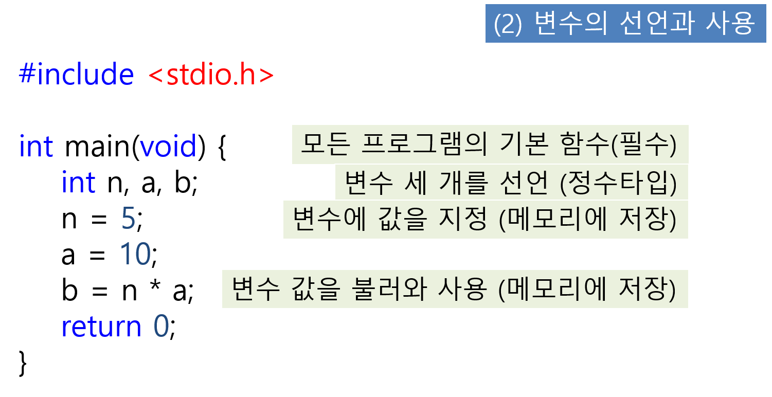 - 파이썬은 변수를 선언하지 않고 사용하지만 C 언어는 변수를 반드시 미리 선언해야 합니다.